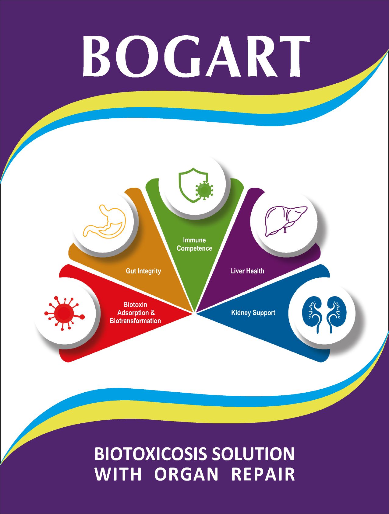 BOGART is a poultry health supplement formulated with essential vitamins, minerals, and electrolytes to support growth, improve feed efficiency, and enhance overall immunity in birds. It is designed for use in drinking water to maintain optimum health and performance during stress and production periods.